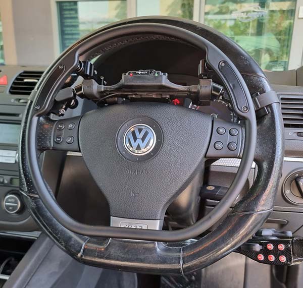 It attaches to the original steering wheel without interfering with the airbag deployment, and is generally paired with the Brake Lever.